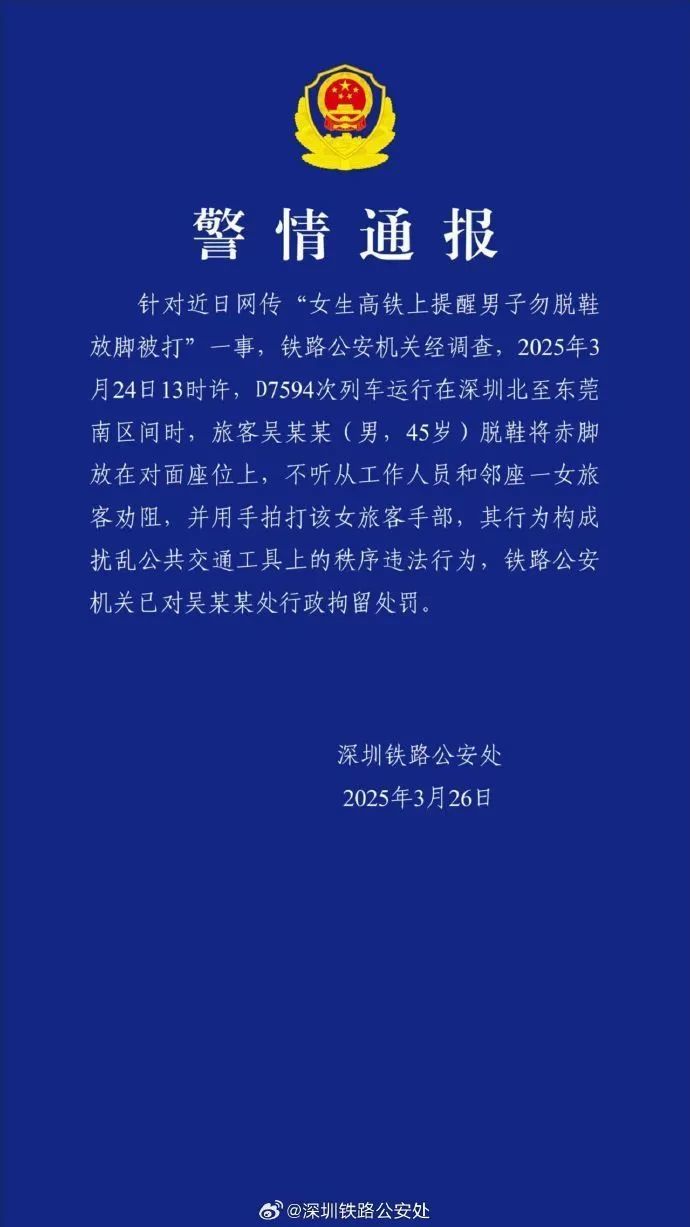@深圳铁路公安处 3月26日发布警情通报:针对近日网传“女生高铁上提醒男子勿脱鞋放脚被打”一事,铁路公安机关经调查,2025年3月24日13时许,D7594次列车运行在深圳北至东莞南区间时,旅客吴某某(男,45岁)脱鞋将赤脚放在对面座位上,不听从工作人员和邻座一女旅客劝阻,并用手拍打该女旅客手部,其行为构成扰乱公共交通工具上的秩序违法行为,铁路公安机关已对吴某某处行政拘留处罚。