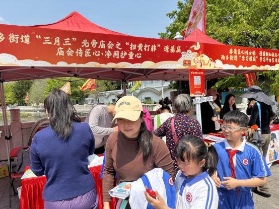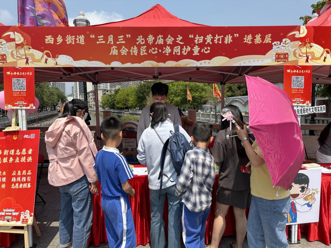 3月26日,2025年深圳市宝安区西乡街道省级非物质文化遗产——西乡北帝“三月三”庙会正式启动,一系列精彩纷呈的文化盛宴庙会大巡游、非遗展演、千岁盆菜宴等拉开序幕。西乡街道“扫黄打非”办搭便车,将“扫黄打非”宣传专列开进庙会,创新融入“扫黄打非·绿书签”护苗行动及未成年保护宣传,为居民奉上一场传统民俗与安全教育的“双料大餐”,筑牢居民群众的安全防护墙。