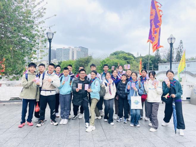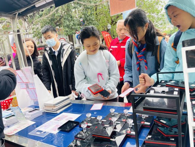 北帝古庙的香火缭绕依旧,研学队伍蜿蜒穿行于西乡街的石板路。碑文里的金字化作街边糖水的香气,古籍中的醒狮跃入霓虹灯牌的微光——历史不再蜷缩于课本褶皱的纸页间,“非遗”从泛黄的史册跃入沸腾的市井。学生们举起手机,将镜头对准明信片上鲜红的庙会文化印章,闪光灯掠过印章中“北帝古庙”字样。快门声与庙会的锣鼓声共振,文化的基因正随着他们的指尖轻点,在数字时代的烙印中悄然流转。