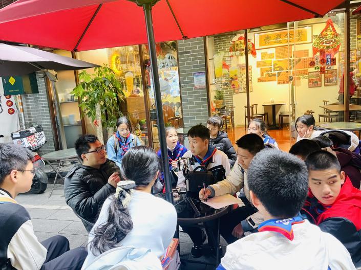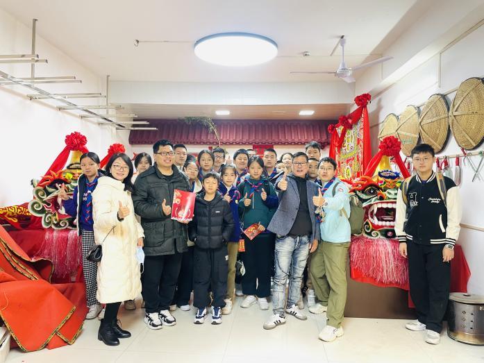 走出古庙,研学队伍钻进川流不息的庙街,在“探花糖水铺”驻足。徐浩浩向学生们介绍起庙街的“状元……”“榜眼……”“探花糖水铺”的来历,学生们这才明白,西乡人早已将庙会民俗与历史人文紧密关联起来。而转角处的“虎狮馆”更掀起高潮。馆内陈列着风格各异的醒狮头与虎狮头,引起了学生们的极大兴趣。徐浩浩向大家讲述了“深汕一家亲”的故事。“醒狮不仅是非遗技艺,更是西乡人‘包容和敢为天下先’的精神图腾。”