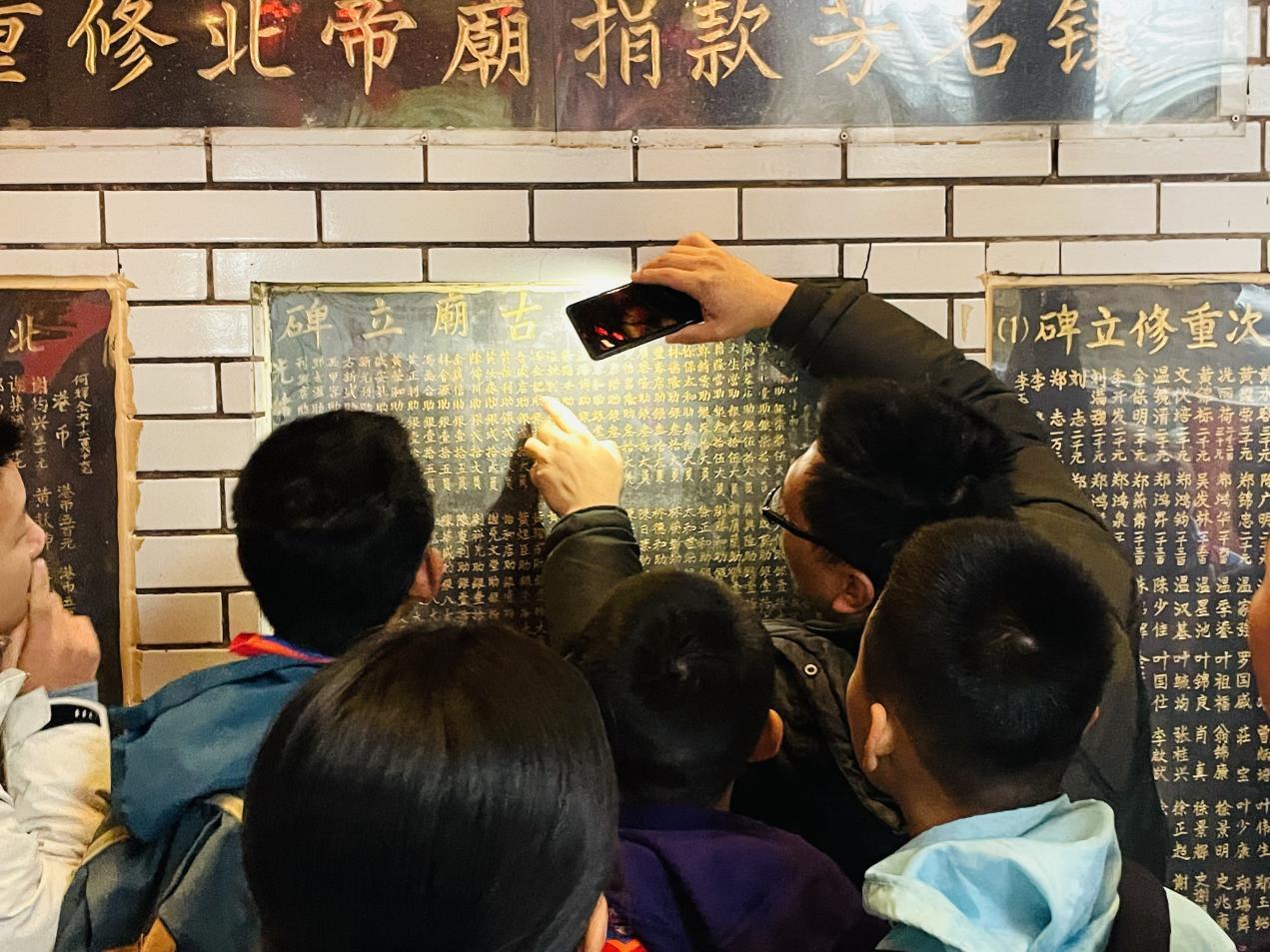 3月30日清晨,正值西乡北帝三月三庙会期间,西乡北帝古庙前香火缭绕,一群中学生在摩肩接踵的香客中俯身触摸清代石碑,指尖掠过“回春堂”“黄炳记”等斑驳的商号刻痕——这些百年前的捐资名录,此刻成了“新西乡人”探寻文化根脉的“密钥”。深圳某研学机构组织的“解码西乡非遗”活动中,20余名学生跟随本土青年学者徐浩浩,在喧闹的庙会里上了一堂“可触摸的历史课”。