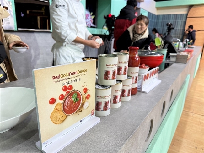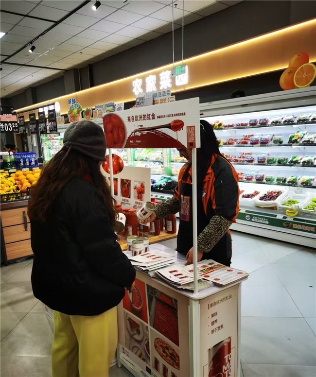 春节前夕的超市总是格外热闹,欧洲红金西红柿主题堆头其醒目的红色主视觉吸引了不少顾客驻足。大红色的装饰与中国结相得益彰,吸引了不少置办年货的顾客。许多消费者表示,看到这喜庆的红色就忍不住想带几罐回家。