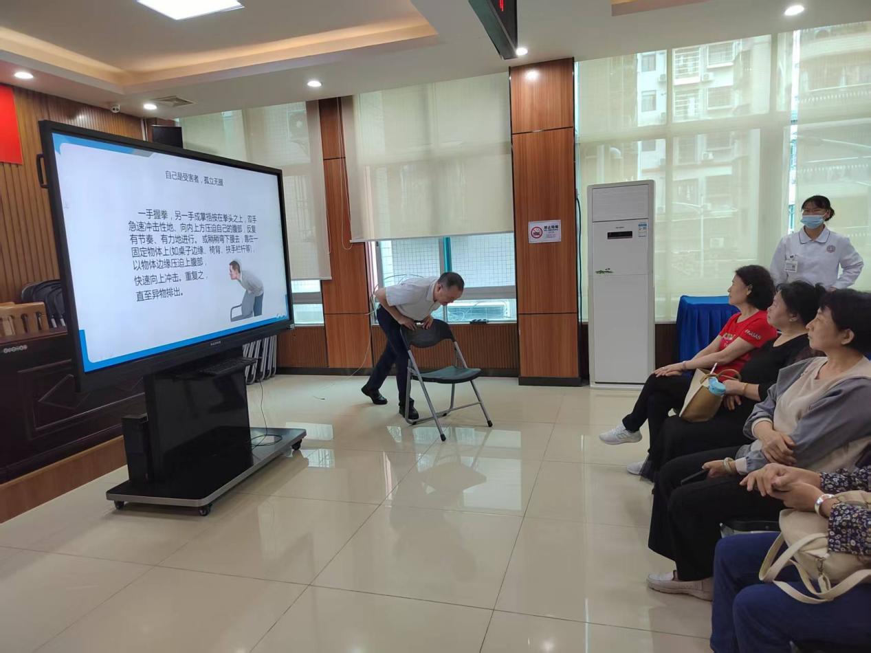 社康医生针对几类人群分别教学。对婴幼儿进行急救时,医生重点演示掌根拍背法:将患儿面部朝下置于前臂,用掌根在肩胛骨之间快速拍打五次,若异物未排出则立即转为胸部按压法。对于成人急救,则采用环抱压腹法,医生用“剪刀石头布”口诀帮助长者记忆手势定位——剪刀手定位肚脐上方两横指,布手包住拳头向内向上冲击。理论讲解后,保安扮演受噎患者,医生一步步进行示范。65岁李爷爷边录像边念叨:"小孙子才三岁,学会这个心里踏实多了。"