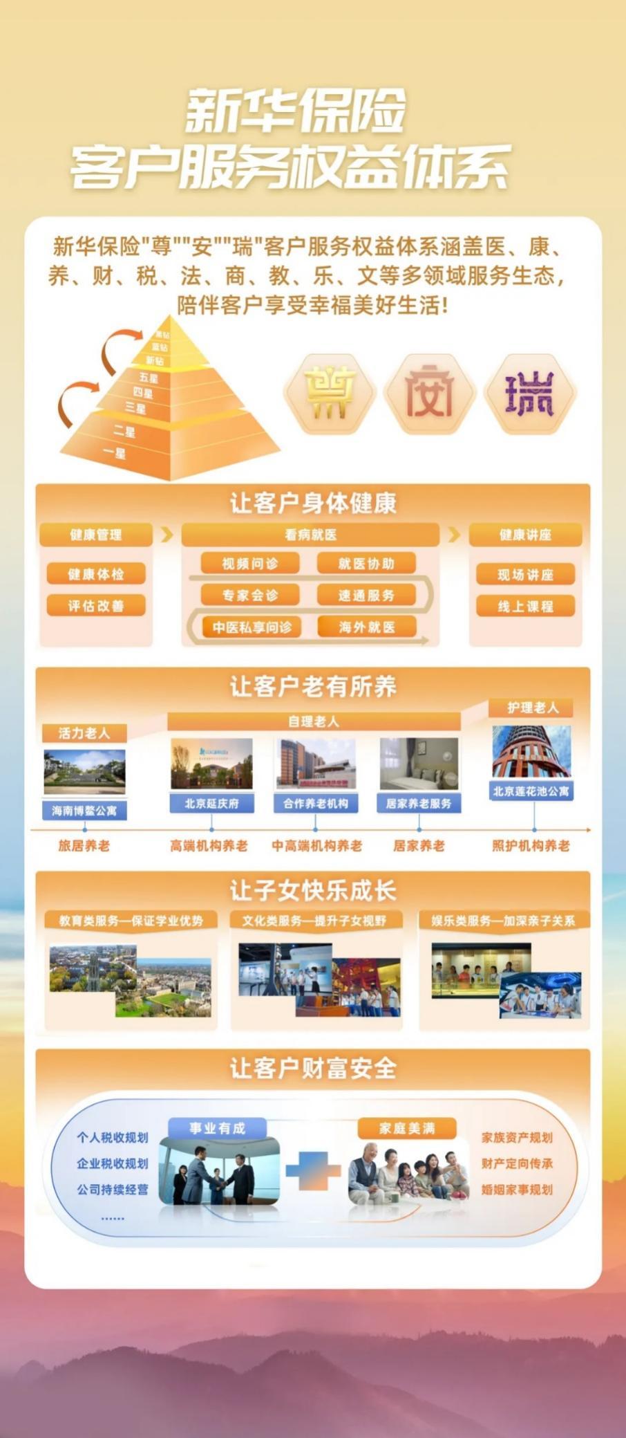 让客户身体健康。新华保险引入知名三甲医院、高端体检机构和头部互联网医疗机构的服务资源,提供视频医生、健康体检、就医协助、多类速通等服务,守护客户的身体健康。让客户财富安全。围绕客户在财富代际传承、婚姻财产保全、家族法务税务及家企资产规划等方面的需求,新华保险携手业界顶尖律所,提供法律咨询、税务咨询、财税法沙龙等服务,守护客户的财富安全。让客户老有所养。新华保险在自建高端养老社区基础上,与领先的养老服务机构开展深度合作,提供机构养老、旅居养老和居家养老等服务选择,帮助长者在晚年生活中享有尊严与温馨。让子女快乐成长。新华保险与新东方等国内知名教育机构深度合作,提供学业规划、留学咨询、实习就业指导及社会公益实践等服务,帮助孩子们在成才之路上获得更多机会,成就更加光明的未来。
