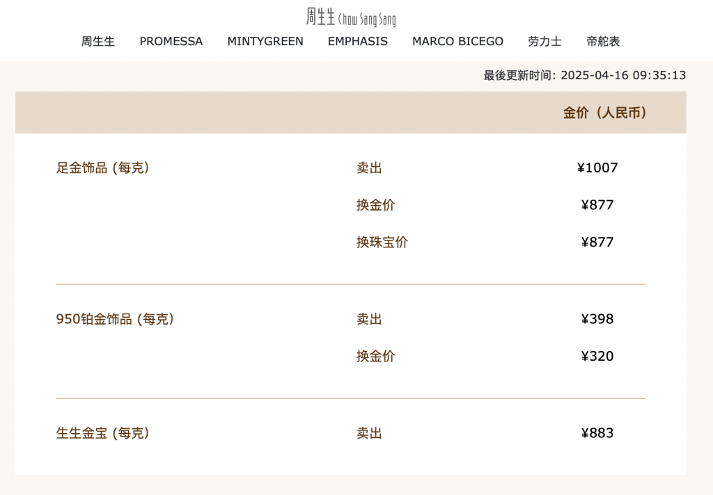 首饰金方面,4月16日,周生生、老庙金饰价格均已突破1000元/克。其中,周生生足金饰品价格为1007元/克,老庙黄金足金金价已达1003元/克,周六福足金999报990元/克,周六福足金999.9报1010元/克。