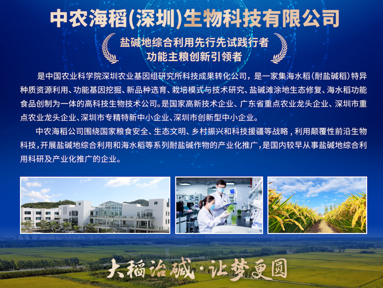 中农海稻是中国农业科学院深圳基因组研究所成果转化公司,以“海水稻育种、海水稻弱碱米与抗性淀粉米种植与加工、盐碱地综合利用”为三大业务主体。未来计划布局100个示范中心,修复1亿亩盐碱地,增收50亿斤生态弱碱米,实现"大稻治碱,让梦更圆"的使命。中农海稻让盐碱地变“金土地”案例,见证深圳科技如何激活乡村产业!