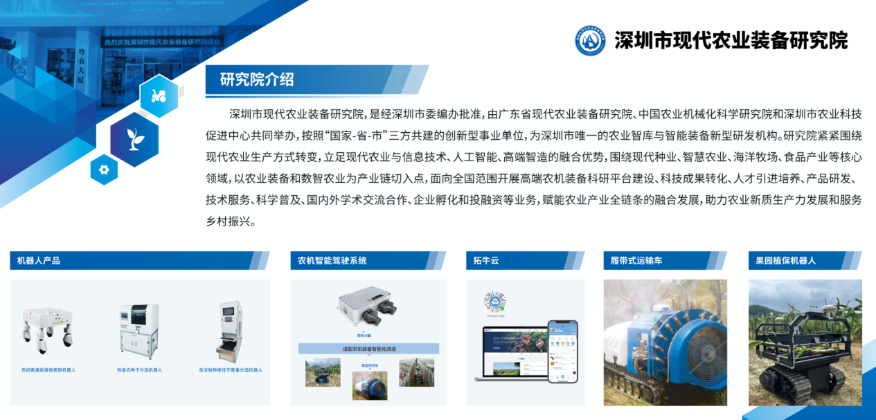 深圳市现代农业装备研究院,由中国农业机械化科学研究院、广东省现代农业装备研究院和深圳市农产品质量安全检验检测中心按照国家-省-市三方共建的事业单位性质新型研发机构。研究院以5G、北斗、人工智能、高端装备制造为技术依托和利用深圳人才优势,聚焦农机农艺融合、机械化和信息化融合等“两融”难题,重点开发系列农业机器人、智能农机装备、大数据+系统认知分析平台。