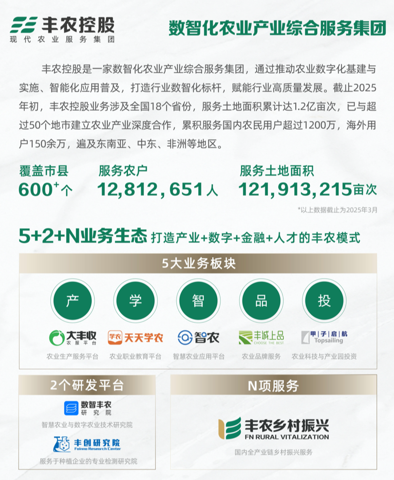 丰农控股集团致力于将数字技术与人工智能技术贯穿于农业产业全过程,构建高效、精准、可持续的现代农业科技服务体系。截止2025年初,丰农控股业务服务涉及全国18个省份,服务土地面积累计达1.2亿亩,已与超过50个地市建立农业产业深度合作,累积服务国内农民用户超过1200万,海外用户150余万,遍及东南亚、中东、非洲等地区。