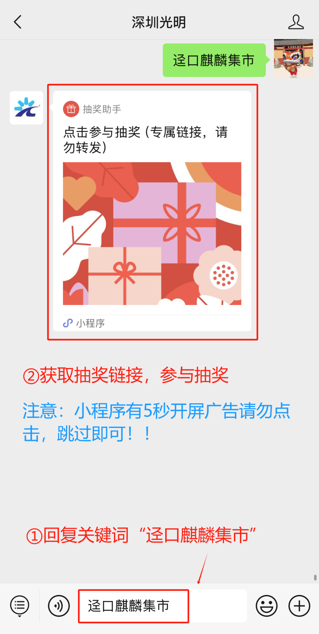 3.在公众号后台回复关键词“迳口麒麟集市”可获取抽奖链接,按照提示上传“点赞+推荐”截图即可参与抽奖。