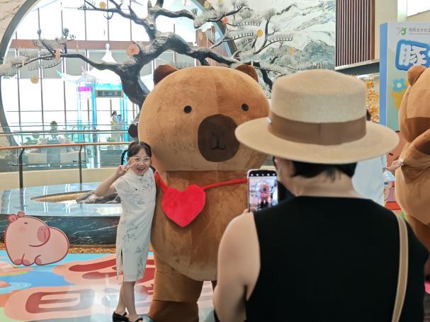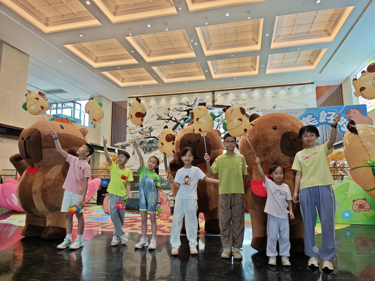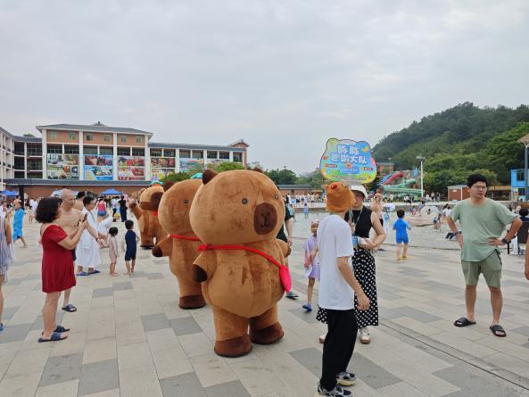 卡皮巴拉人偶巡游:巨型卡皮巴拉气模在酒店大堂供游客打卡,憨态可掬的卡皮巴拉人偶巡游队伍穿梭于景区,与游客热情互动、合影,并随机派发主题周边礼品,成为亲子家庭争相追逐的焦点。