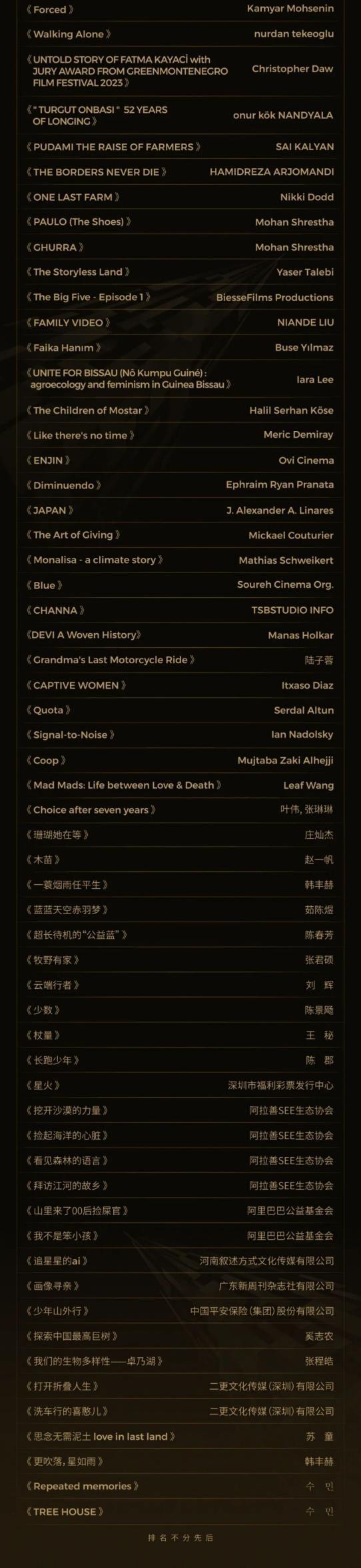自2024年8月开启征片通道以来,斯莫格公益影像奖吸引了来自 120 多个国家和地区,超过50种语言的创作者踊跃参与,共征集到 3891 部公益内容影片,其中海外影片占比达77%。创作者群体极为多元,个人创作者作品占比 74%,他们中有独立电影人、影视从业者等,年龄跨度从 2013 年出生的新西兰学生到 1944 年出生的英国导演。同时,公益机构、政府事业机构、影视文化机构、艺术院校机构等纷纷参与,其中影视文化机构相关影片达 900 部,近 900 个不同院校如中央戏剧学院、纽约电影学院的创作者也贡献了作品。经过初审专业评委们的层层筛选,最终共98部公益影像作品脱颖而出,其中海外影片占比71%。