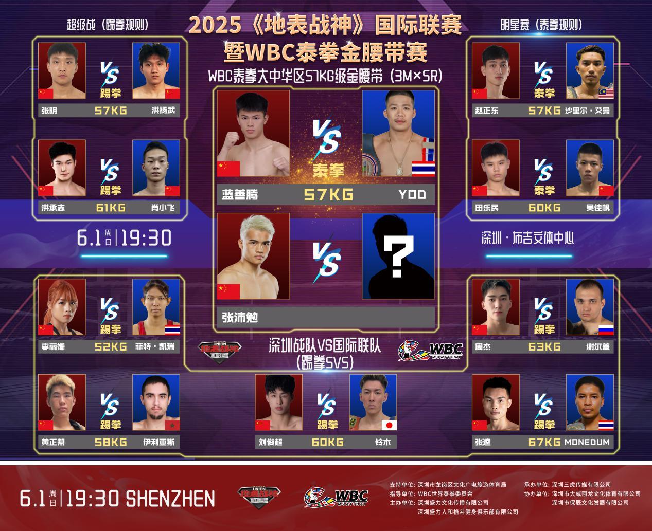 赛事由深圳盛力人和格斗健身有限公司主办,深圳三虎传媒有限公司联合运营,在WBC世界泰拳委员会权威指导下,汇聚来自中国、俄罗斯、泰国、马来西亚、日本、摩洛哥等国家顶尖选手。其中WBC泰拳大中华区金腰带五回合争夺战成为最大看点,中国新生代拳王蓝善腾将与泰国悍将YOD展开史诗对决,而"战斗鸡"张沛勉领衔的踢拳5V5跨国战队对抗更将点燃团队荣耀之战。据赛事总监透露,本次参赛选手世界排名前二十占比达40%,创下国内泰拳赛事历史新高。