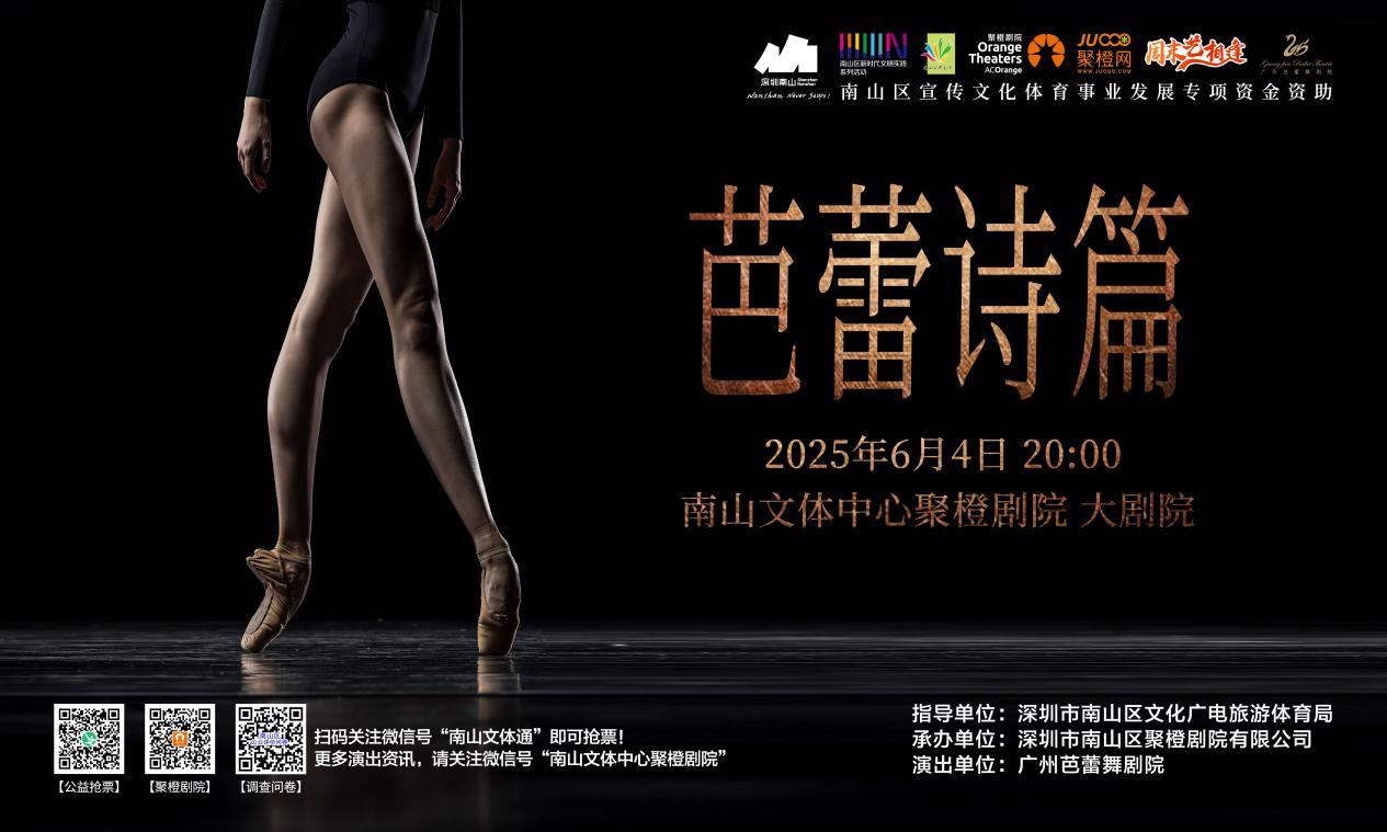 由深圳市南山区文化广电旅游体育局指导,深圳市南山区聚橙剧院有限公司承办的2025年南山公共文化活动《周末艺相逢》公益演出系列开幕演出——广州芭蕾舞剧院《芭蕾诗篇》将于6月4日晚南山文体中心聚橙剧院拉开帷幕。
