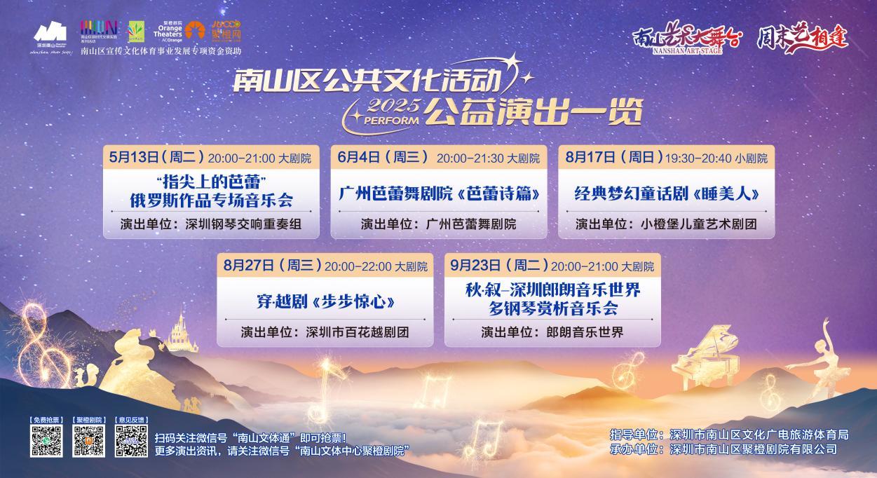 2025年的《周末艺相逢》和《南山艺术大舞台》在5月至9月期间共将呈现5台精彩演出,包括“指尖上的芭蕾”俄罗斯作品专场音乐会、广州芭蕾舞剧院《芭蕾诗篇》、经典梦幻童话剧《睡美人》、穿·越剧《步步惊心》、秋·叙-深圳郎朗音乐世界多钢琴赏析音乐会等。