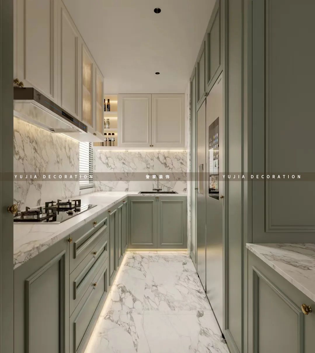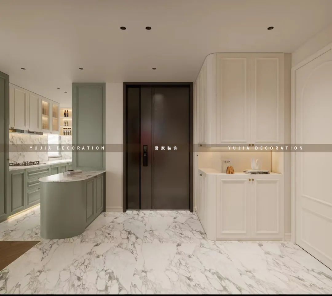 在平面布局规划上,大胆拆除玄关与厨房之间的墙体,打造开放式厨房格局。这一设计不仅有效拓展了进门空间,更赋予入户区域强烈的仪式感,让每一次归家都成为一场优雅的仪式。
