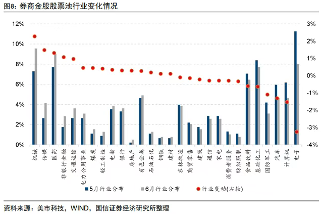 行业方面,国信证券研报指出,在对券商金股股票池进行去重后,从绝对占比来看,券商6月金股在机械、医药、电子、基础化工、食品饮料等行业配置较高。
