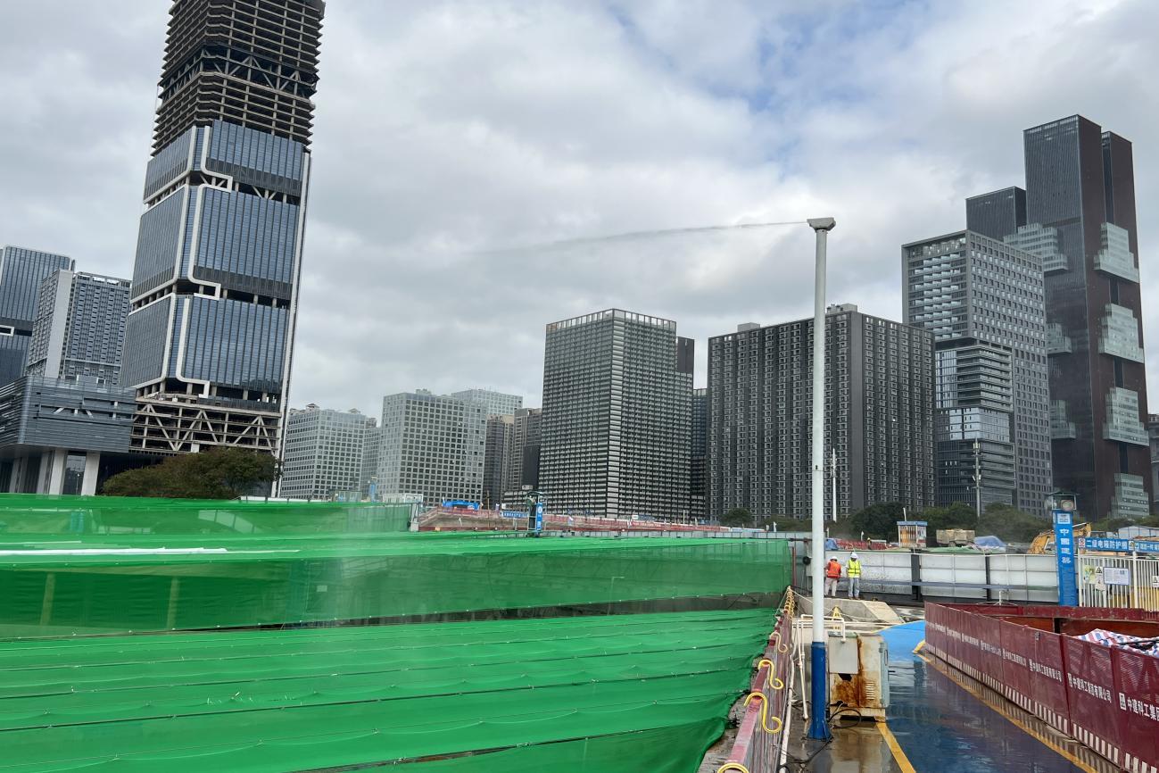从留仙洞战略性新兴产业总部基地远眺,中建科工七街坊联建大厦项目施工建设如火如荼,这里却颠覆了人们对传统工地尘土漫天、噪音轰鸣的固有印象。项目部积极贯彻政府主管部门关于扬尘、噪声治理的文件精神,安装集防尘、降噪、遮阳、降温等诸多功能于一身的“智能天幕” 系统,以实际行动践行绿色建筑发展理念。这座深圳南山区的未来产业地标,正以科技赋能的“静音净尘”模式,创新开展城市核心区绿色施工。