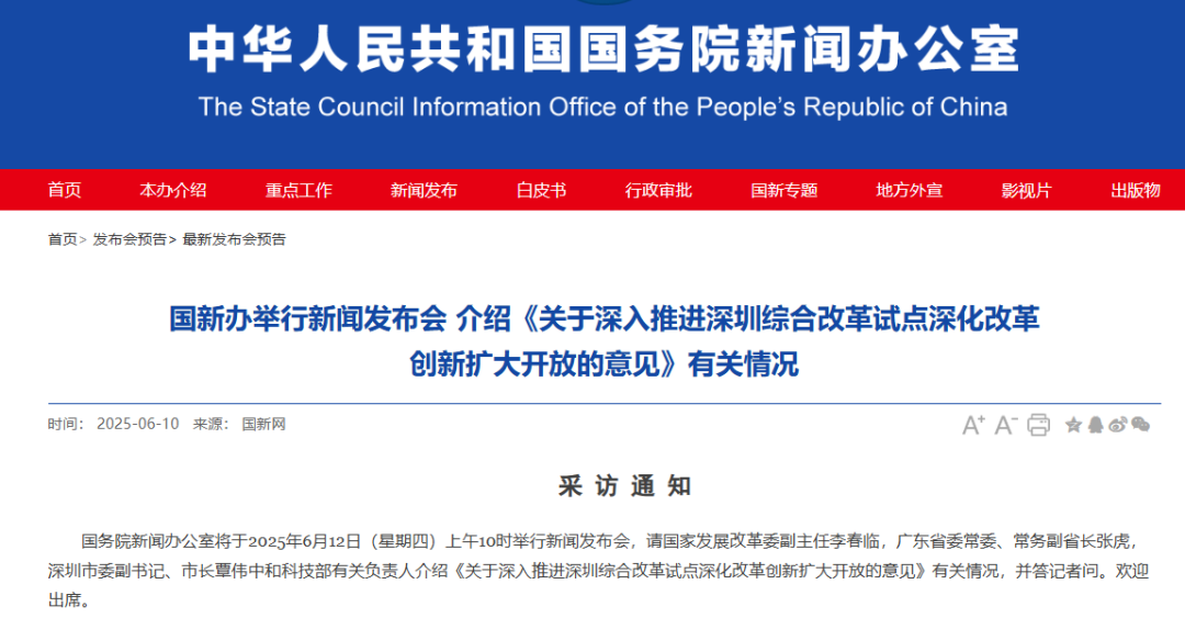 国务院新闻办公室将于2025年6月12日(星期四)上午10时举行新闻发布会,请国家发展改革委副主任李春临,广东省委常委、常务副省长张虎,深圳市委副书记、市长覃伟中和科技部有关负责人介绍《关于深入推进深圳综合改革试点 深化改革创新扩大开放的意见》有关情况,并答记者问。