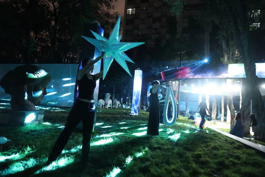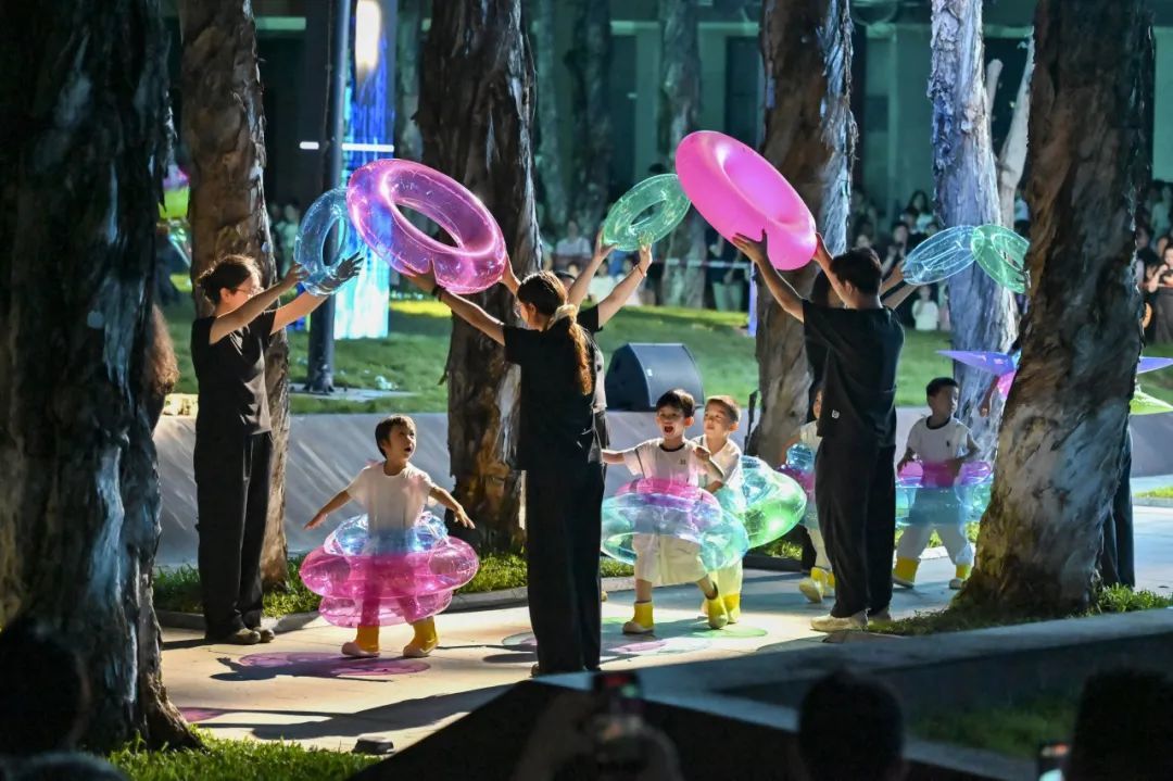 第四幕演绎了人类与智能体共创的生成式艺术。物件梦进现实,孩子们环绕嬉戏,在剧场里游成光的轨迹,奏响人声与算法的童谣,象征人类与智能体完成从“技术辅助”到“基因融合”的进化,打破认知边界,跃迁至未知与无限。