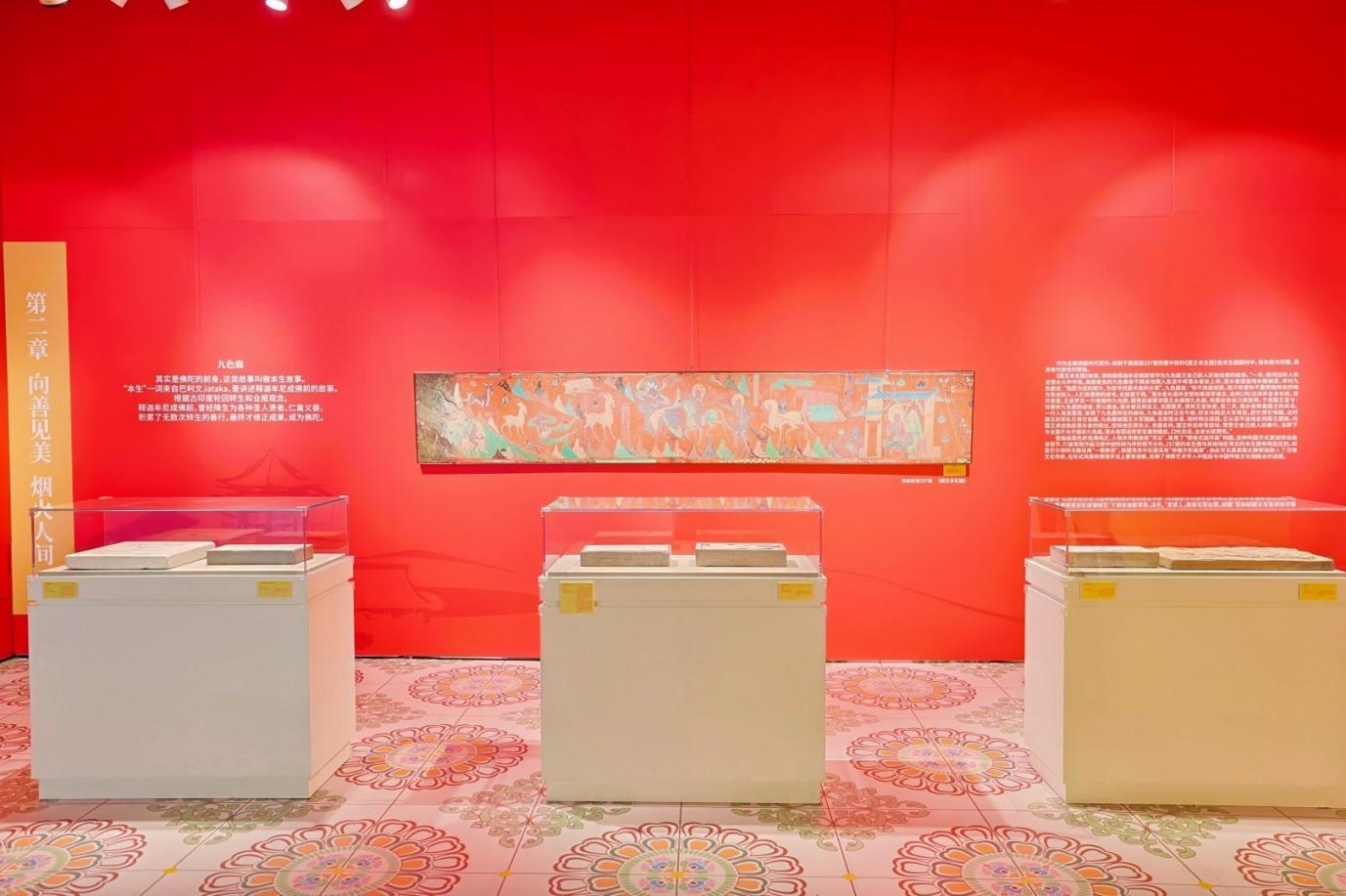 “向善见美 烟火人间”板块开篇聚焦北魏·莫高窟第257窟的《鹿王本生图》,讲述佛教艺术传入中国后与本土文化相融合的动人故事。展出的敦煌西晋画像砖(复制品)是敦煌汉唐文化的缩影,花砖上丰富的题材反映了当时敦煌繁荣的经济社会面貌与多元文化交融。