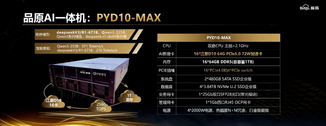 在存储和互联方面,江原D10搭载LPDDR5显存,速率达6400Mbps,容量达到128GB,为大模型的运行提供了存储支撑。同时,其采用业内领先的PCIe5.0技术,实现了128GB/s的互联带宽,保障了单机多卡协同计算的通信效率。基于以上优势,江原D10构建的单机16卡高算力密度系统,已能够支持DeepSeek 671B满血版运行。