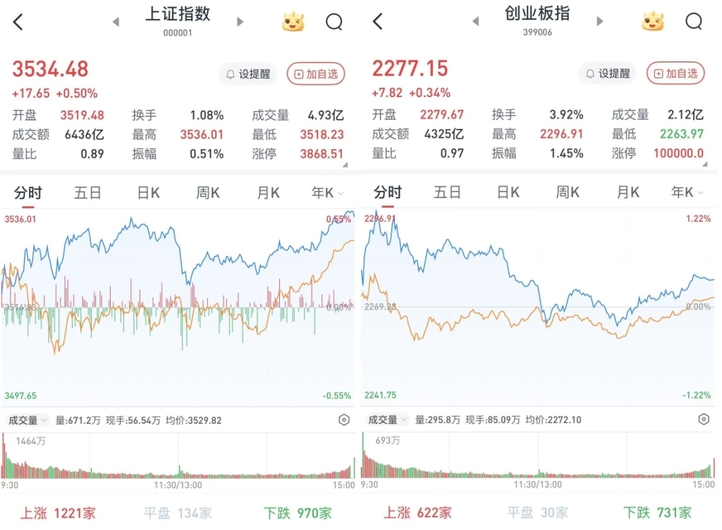 至收盘,上证综指涨0.5%,报3534.48点;科创50指数涨0.19%,报1007.53点;深证成指涨0.37%,报10913.84点;创业板指涨0.34%,报2277.15点。