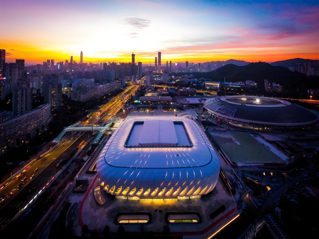 深圳市体育中心坐落于福田区笋岗西路,紧邻华强北商圈,交通便利。其作为集专业竞演、全民健身、公共休闲、文体交流、群体活动、交通集散为一体的复合型城市体育综合体,由体育馆、体育场、游泳跳水馆、网羽中心、体育运动长廊等配套全民健身公共设施及相关配套空间组成。其中,综合体育馆可容纳约1.6万名观众,配备开合式屋盖、可移动四面斗屏等先进设施,是国内首例融合多项高科技的综合性场馆;体育馆副馆设有2400个座位,配备了篮球热身馆和训练场,为参赛队伍提供了专业的赛前准备和训练环境;体育场可容纳4.5万名观众,可承接职业足球赛事、演唱会、音乐节等多类演艺赛事活动。