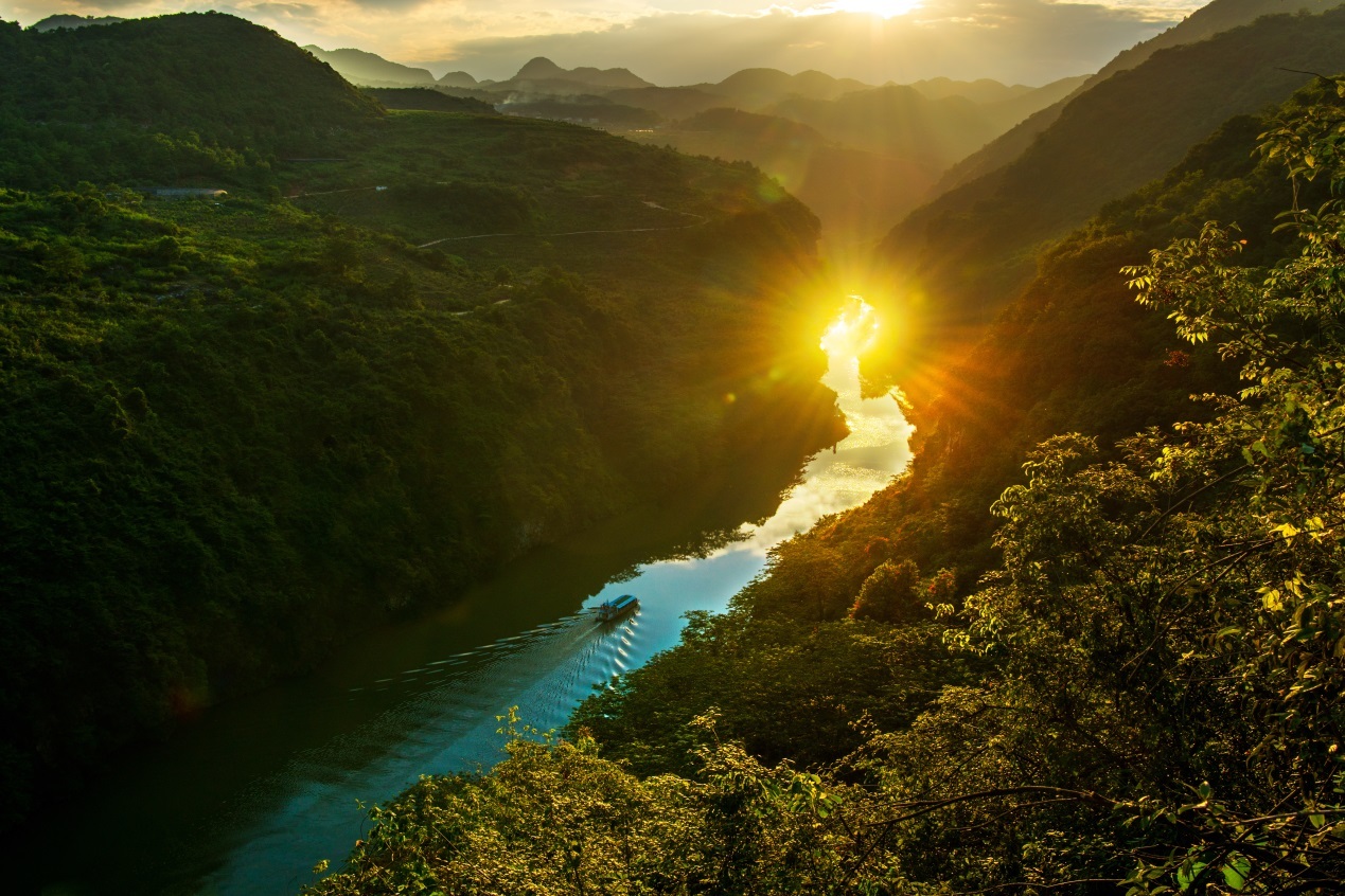 轻舟漫游,水墨画廊:乘船游览湟川三峡,两岸喀斯特地貌奇峰耸立,瀑布飞流直下(如“龙泉飞瀑”),清凉水汽扑面而来。