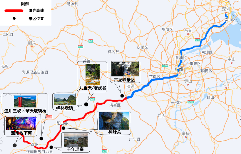 路线精华:广州/深圳/东莞/佛山等地出发→清连高速(G4W2)→清远(戏水)→阳山(服务区休整/美食)→连州(溶洞/采摘/瑶乡风情)≈ 车程约3-3.5小时。