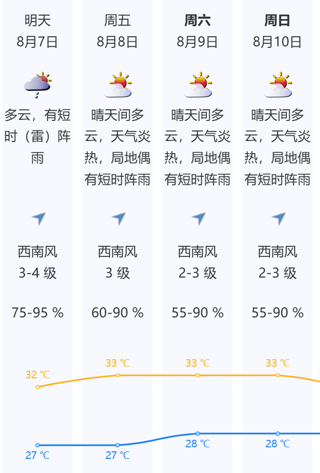 7日白天转多云,可见阳光,局地有(雷)阵雨,气温27-32℃;