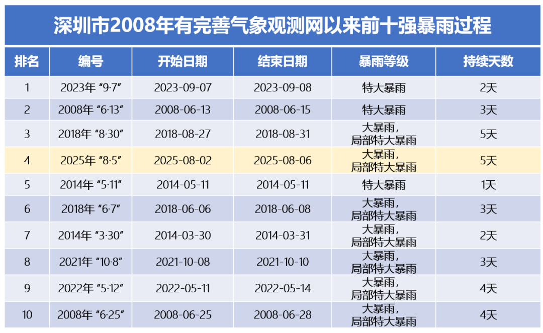 8月2日夜间至6日,我市出现多轮大暴雨特大暴雨,是有完善气象观测网以来深圳第4强的暴雨过程,简称“8·5”特大暴雨过程,呈现出“三超三破”的特点(持续时间超长、范围超广、强度超强,破3项历史极值)。