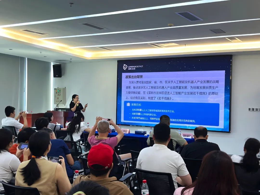 在人工智能及机器人产业政策解读环节,龙华区科技创新局首先介绍了龙华区相关产业发展的基本情况,随后围绕推动产业集聚发展、提升产业创新能力、完善产业生态体系3个方向,详细解读人工智能及机器人产业扶持政策与资助标准,为企业明确发展路径与支持方向,助力产业高质量发展。