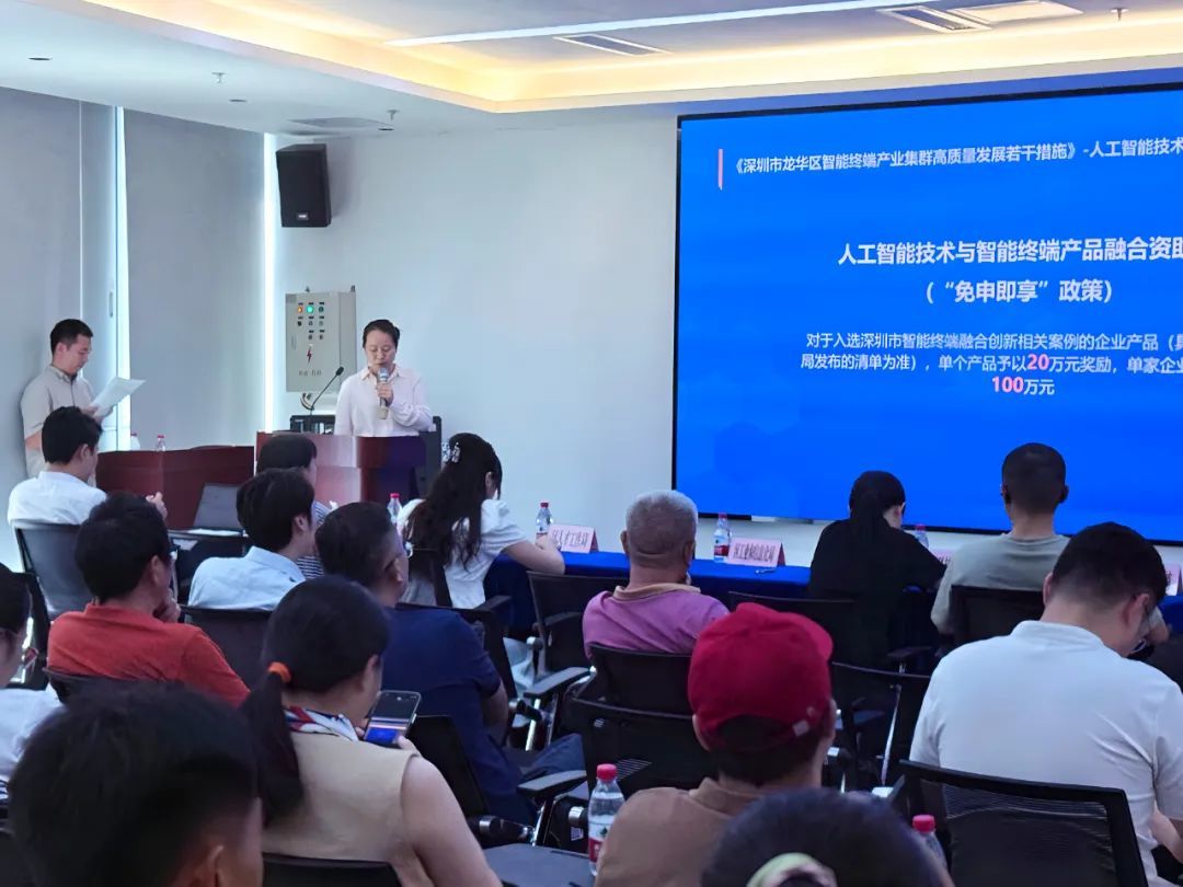 2025年8月8日,由龙华区工业和信息化局主办,龙华区人才工作局、龙华区科技创新局、深圳市市场监督管理局龙华监管局协办的“工信惠企通——人工智能终端专场”在龙华区知识产权服务中心圆满结束。本次活动采用“线下宣讲+线上直播”双轨模式,共吸引30余家企业线下参与,超400家企业线上观看。活动聚焦企业发展需求,带来政策解读、资源对接等多重干货,助力企业抢占产业风口。
