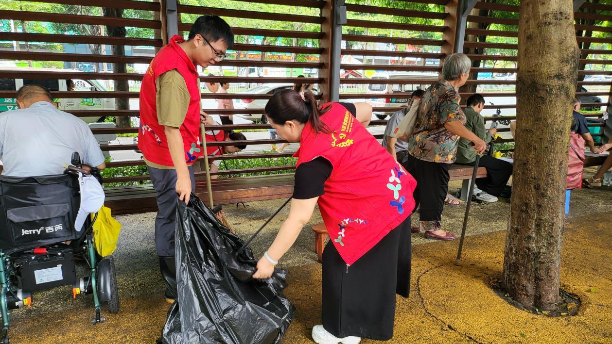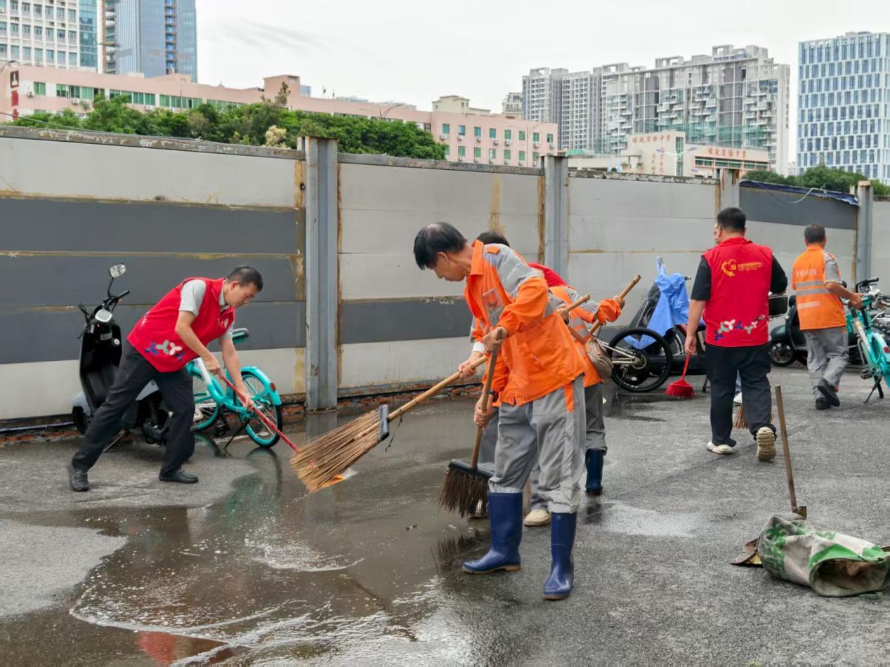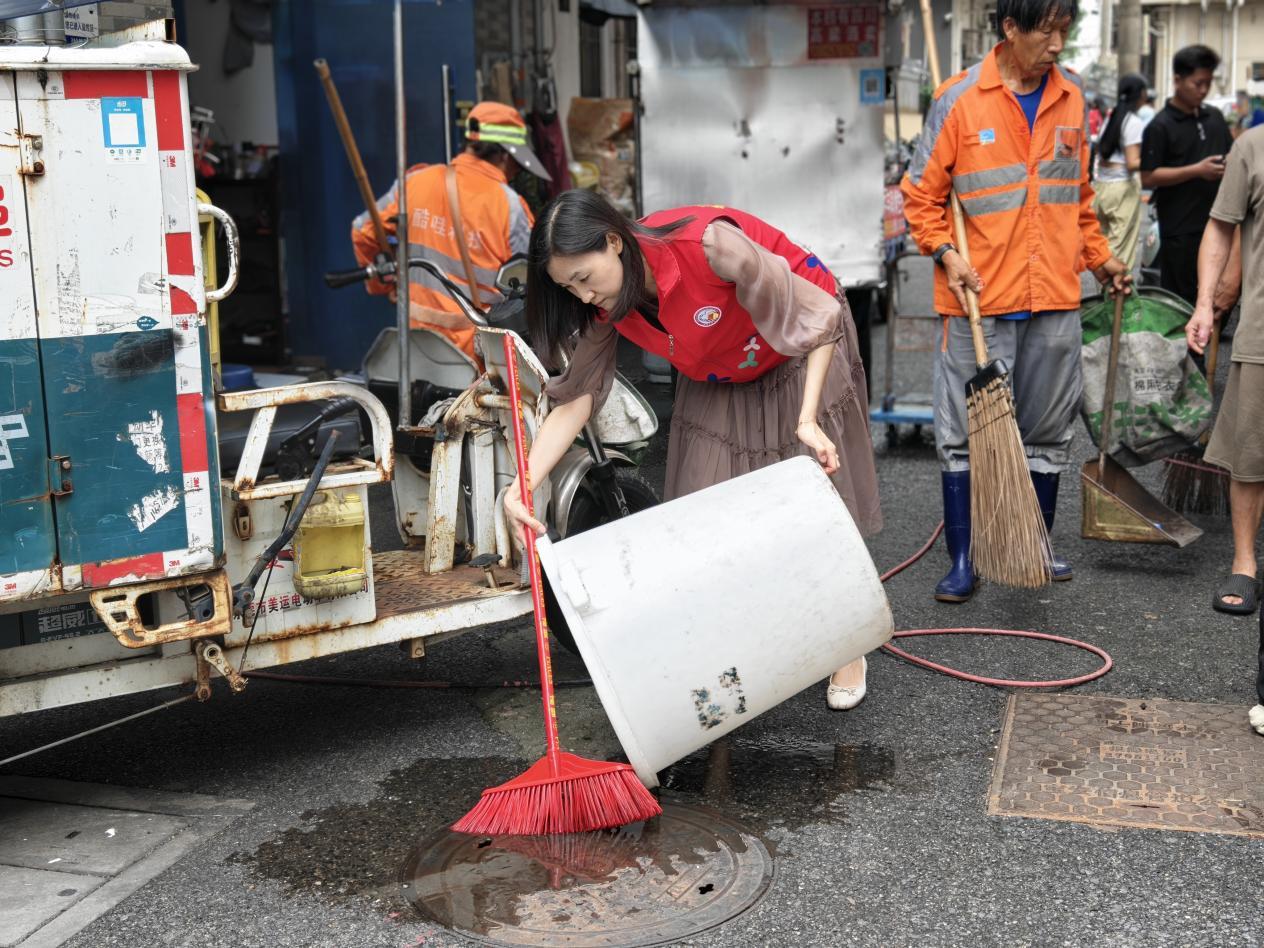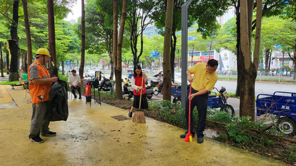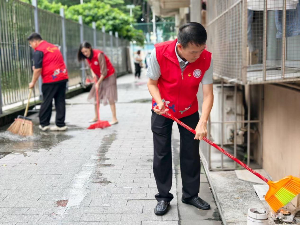 8月19日下午,社区党员身着 “党员志愿者” 马甲率先行动,带领各参与方分区域推进整治:在老旧小区,党员与志愿者逐楼清理楼道杂物,物企保洁团队用高压水枪冲洗单元门及公共路面;在城中村区域,股份公司代表协助疏导商户门前交通,社区工作人员 “突击小组”着力于积水清扫、扫除楼栋死角堆积的垃圾;针对径贝社区街心公园公共绿地内的枯枝落叶、隐藏垃圾,党员、社区工作人员及志愿者们分工协作,用手捡、用袋运,不放过任何卫生死角。过程中,不少居民受氛围感染,主动加入清扫队伍,形成 “党员带头干、群众跟着干” 的热烈氛围。