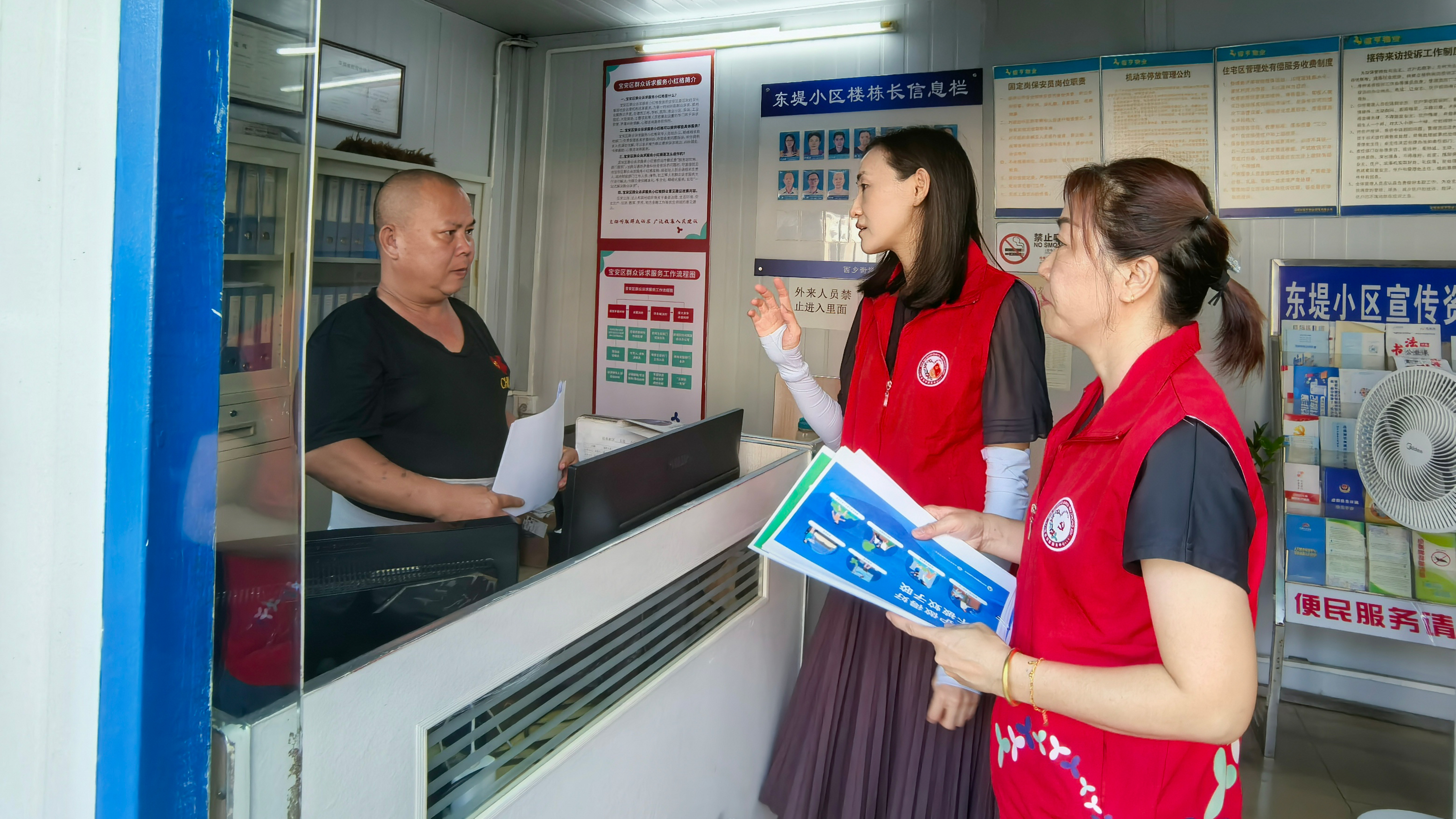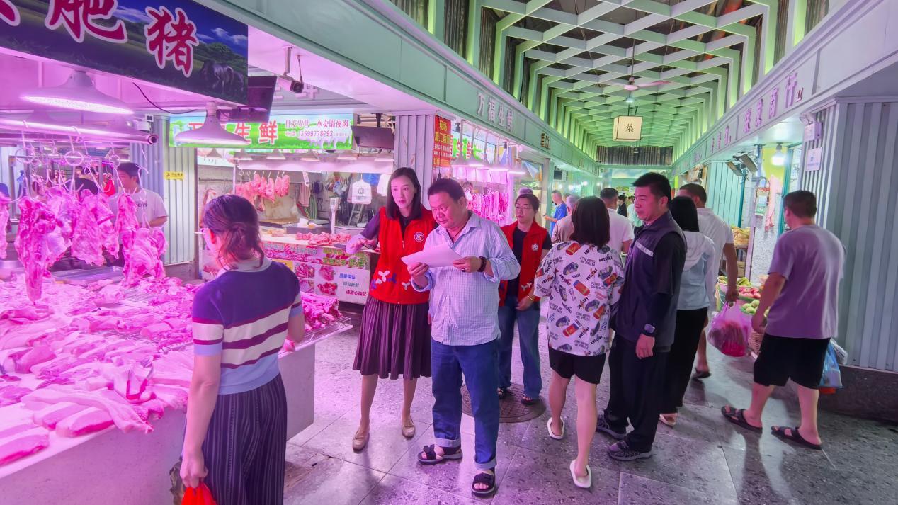 专题部署会一结束,社区党委书记林毅怡便即刻带领各片区负责人直奔一线,以“宣传 + 部署”的模式双线推进工作。在福中福市场与宝源街心公园这两处人流密集场所,社区工作人员通过设立宣传点、发放《环境整治宣传册》《社区卫生公约》等资料,向商户、居民面对面讲解清扫行动意义,引导大家主动清理公共区域杂物、规范垃圾投放;针对市场内商户占道经营、垃圾清运不及时等问题,林毅怡现场与商户代表沟通,明确整改要求与时限。随后,一行人又前往各物业管理处,结合前期会议分工,细化环卫工作布置:要求物业提前清点扫帚、清运车等工具数量,划定保洁人员责任片区,同步做好活动当天与股份公司、居民志愿者代表的衔接工作,确保各项任务落地落细。