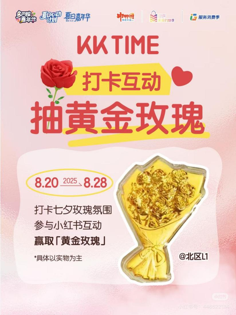 8月20日-8月28日,打卡七夕玫瑰参与小红书互动抽取“黄金玫瑰”。
