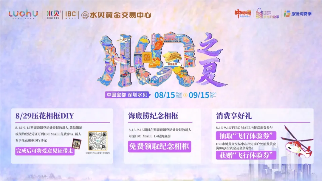 新人凭罗湖结婚证+消费票据,8月20日-9月10日可领免费珠宝检测券;消费还能领“地王观光2人同行1人免单券”,更有足金喜饼限量申领,消费即享叠加福利~