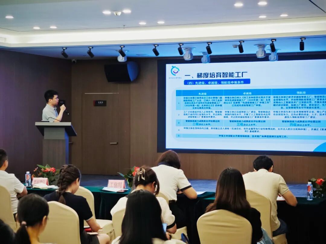 随后,龙华区工业和信息化局数字经济发展促进中心相关负责同志聚焦数字化转型工作展开介绍。在政策支撑方面,推出支持“工业互联网”示范应用、支持企业上云上平台、工业企业技术改造等政策,并深入解读企业上云上平台的扶持细则;在服务保障方面,通过深圳数字赋能公共服务平台提供数字化转型超市、科学权威测评等服务,遴选领航云服务商提供云计算SAAS产品与解决方案,此外还政企协同定制个性化方案,发放云服务券并提供订单式、总包式服务;在培育升级方面,明确梯度培育智能工厂的自评标准、申报条件与流程,以及5G工厂的建设路径与遴选规则,全方位助力企业数字化转型。