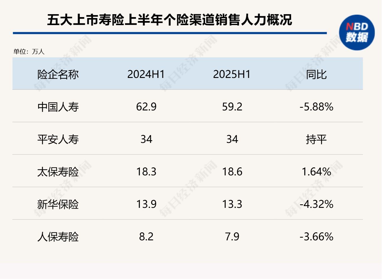 具体来看,上半年,中国人寿个险销售人力为59.2万人,较去年同期的62.9万人同比下滑5.89%;平安寿险个人寿险销售代理人数量为34万人,与去年同期基本持平;太保寿险月均保险营销员18.3万人,期末保险营销员18.6万人,同比增长1.6%;人保寿险营销员规模人力7.9万人,较去年同期的8.2万人下滑3.66%;新华保险个险代理人规模人力13.3万人,较去年同期下滑4.3%。