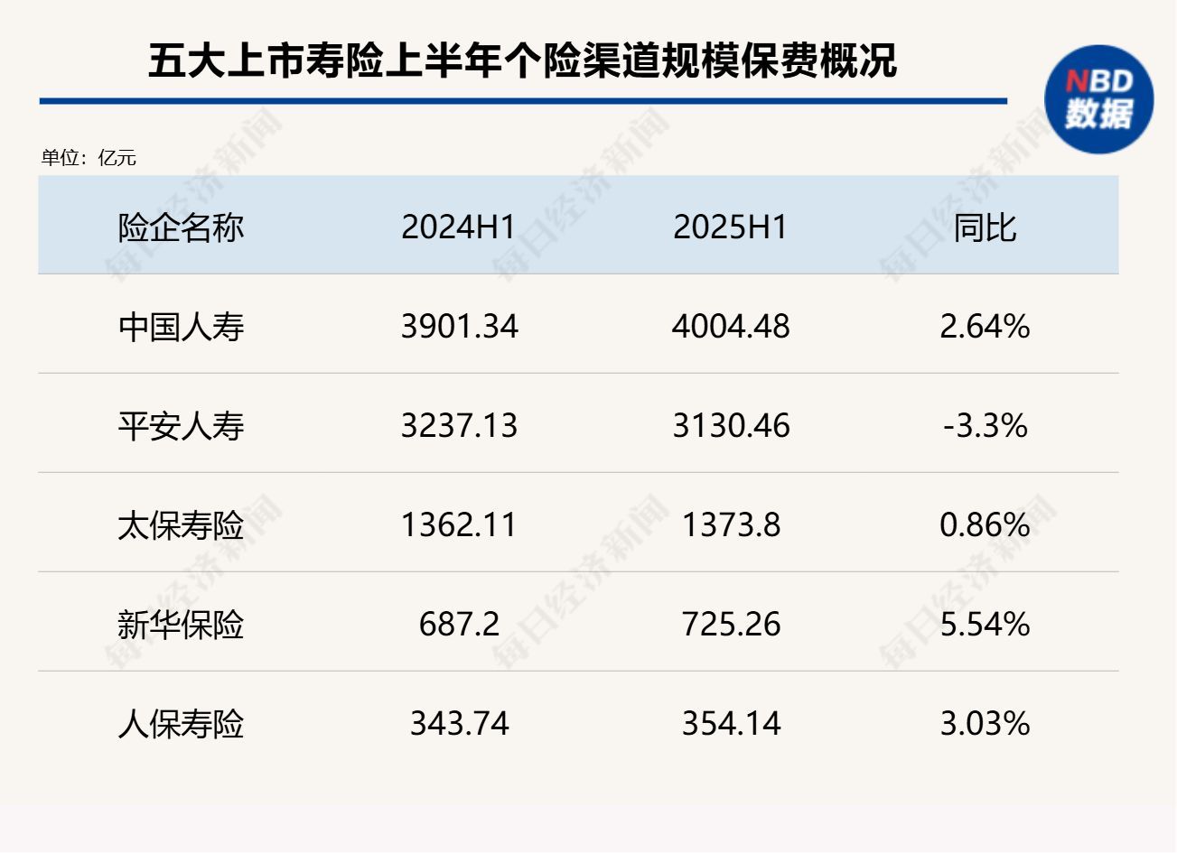 数据显示,上半年,中国人寿个险渠道总保费为4004.48亿元,同比增长2.6%;中国平安寿险及健康险业务代理人渠道规模保费3130.46亿元,同比下滑3.3%;太保寿险代理人渠道规模保费1373.8亿元,同比上涨0.9%;新华保险个险渠道原保险保费收入725.26亿元,同比上涨5.5%;人保寿险个人保险渠道原保险保费收入354.14亿元,同比增长3%。