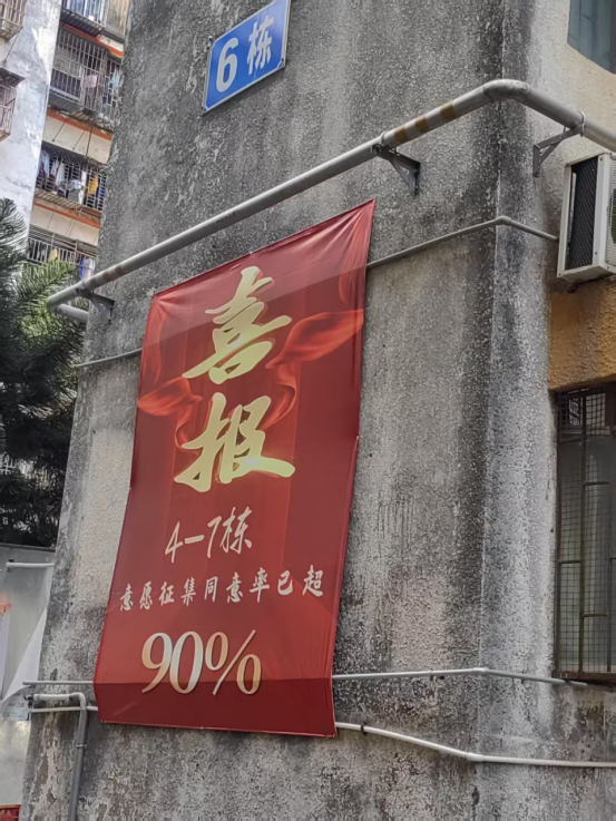 近日,证券时报记者再次前往位于深圳罗湖区清水河街道的红岗花园,发现小区内张贴了许多关于旧改的标语,同时还有许多栋楼的墙体张贴了“喜报”,内容关于自筹资金旧改意愿征集的同意率,多数楼栋的意愿征集同意率都超过90%。不过,这些标语和“喜报”已经略显“陈旧”。
