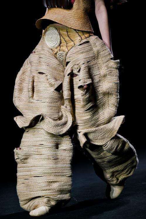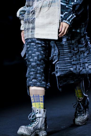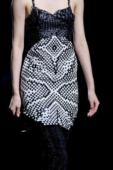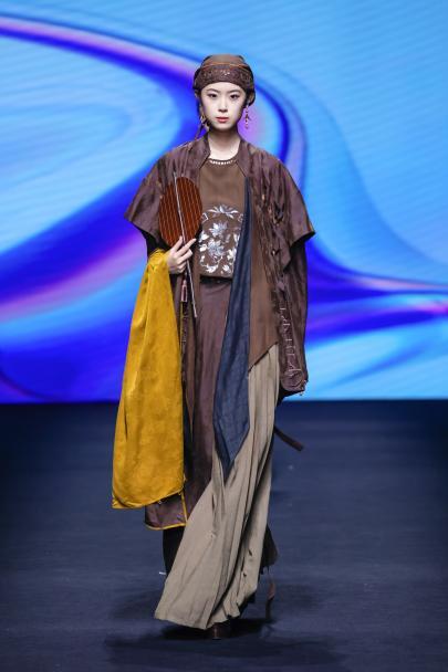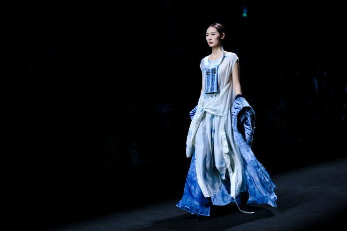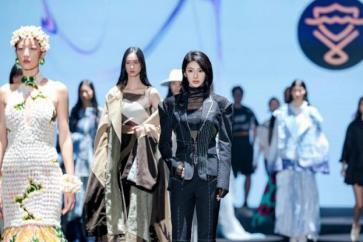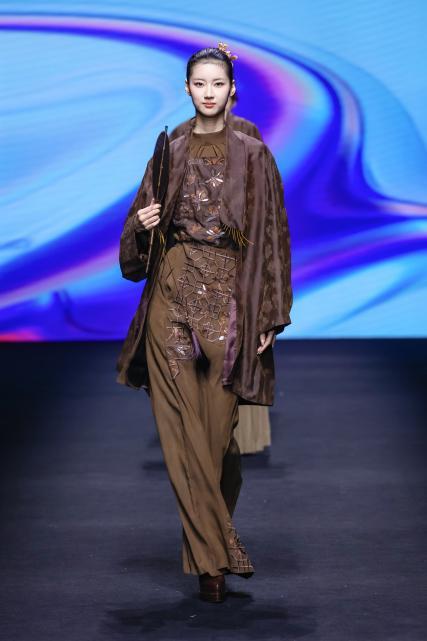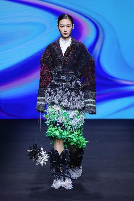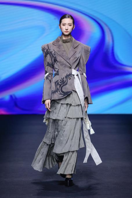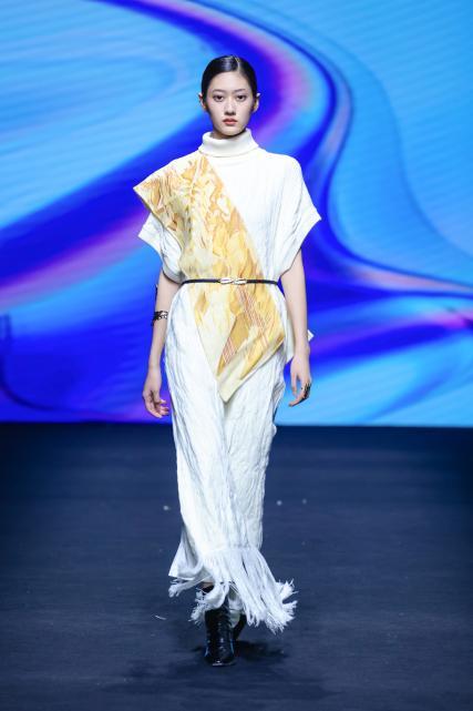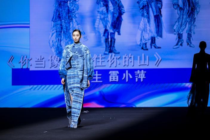 当一阵阵电子音浪与灯光精准同步,第十四届“大浪杯”中国女装设计大赛获奖作品亮相眼前,瞬间引爆全场。这些创作者的设计逻辑成熟完整,敏锐聚焦于玉兰、柳编、麦穗、皮影、窗格等传统文化中“小而美”的具象元素,积极探索材质边界,从天然矿石、泥塑土坯等非传统领域汲取灵感,注重工艺研究与穿着体验,成功将跨界材料融入设计,实现创意与商业的无缝衔接。设计师们积极践行“零浪费”可持续理念,通过重塑废弃布料、二次创作编织袋、回收闲置衣物及快递纸箱等方式,研发新型面料,最大化实现废料活化与资源再利用,展现年轻一代对可持续时尚的担当。
