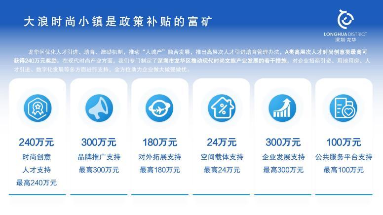 龙华区通过高规格打造“大浪杯”中国女装设计大赛等本土赛事IP,坚持“以赛引才”“政策引才”,为金奖获得者提供最高60万元的奖励。同时,龙华区优化人才引进、培育、激励机制,推动“人城产”融合发展,推出高层次人才引进培育管理办法,A类高层次人才时尚创意类最高可获得240万元奖励。在现代时尚产业方面,专门制定了深圳市龙华区推动现代时尚文旅产业发展的若干措施,对企业招商引资、用地用房、人才引进、数字化发展等多方面进行支持,全方位助力企业做大做强做优。
