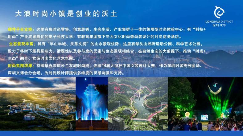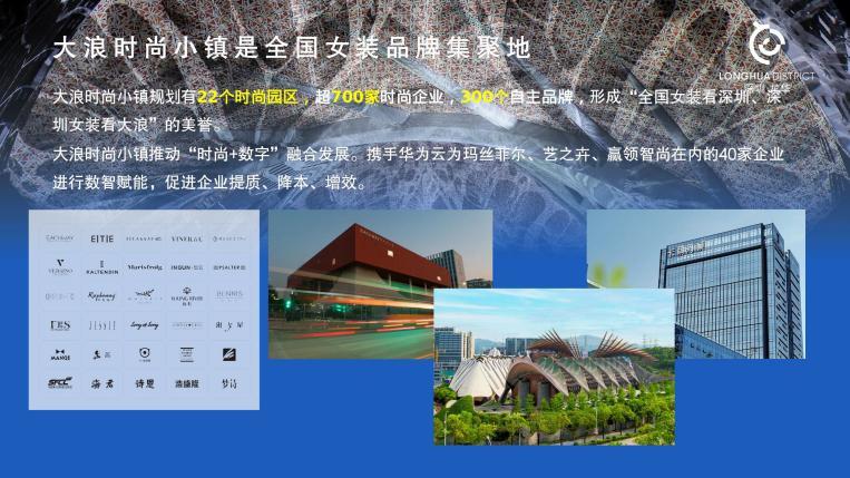 位于龙华区西北部的大浪时尚小镇是现代时尚产业的主阵地,规划面积11.97平方公里,产业核心区1.08平方公里,拥有22个时尚园区,释放优质产业空间150万平方米,超700家时尚企业与300个自主品牌。小镇凭借浓厚的时尚氛围,先后举办深圳米兰双城时尚周、“大浪杯”中国女装设计大赛等活动,深度参与联动深圳时装周、深圳文博会等重量级活动,成为国际化时尚高地。小镇还汇集了各类创意人才近千名,包括赵卉洲、刘勇、毛宝宝等9位中国时装设计“金顶奖”获得者,“中国最佳男装设计师”黄刚,以及彭晶等30位“中国十佳服装设计师”,形成了以“金顶奖”大师为引领、以“中国十佳时装设计师”为中坚力量、以“青年设计师”为新锐力量的多层次设计师人才体系,成为推动小镇时尚产业发展的核心动力,形成了区别于国内其他时尚产业集群的独特竞争力。