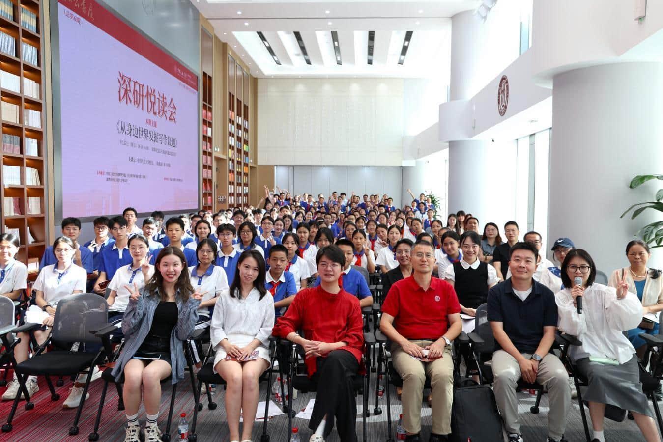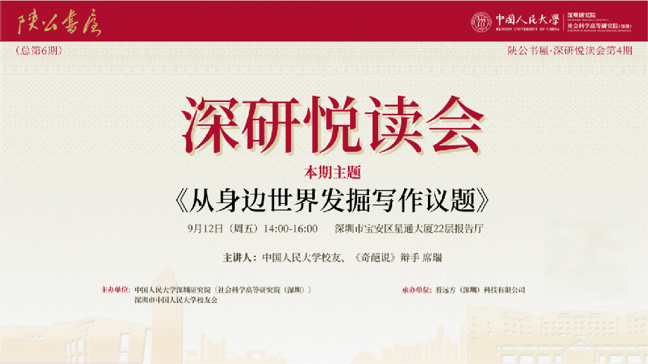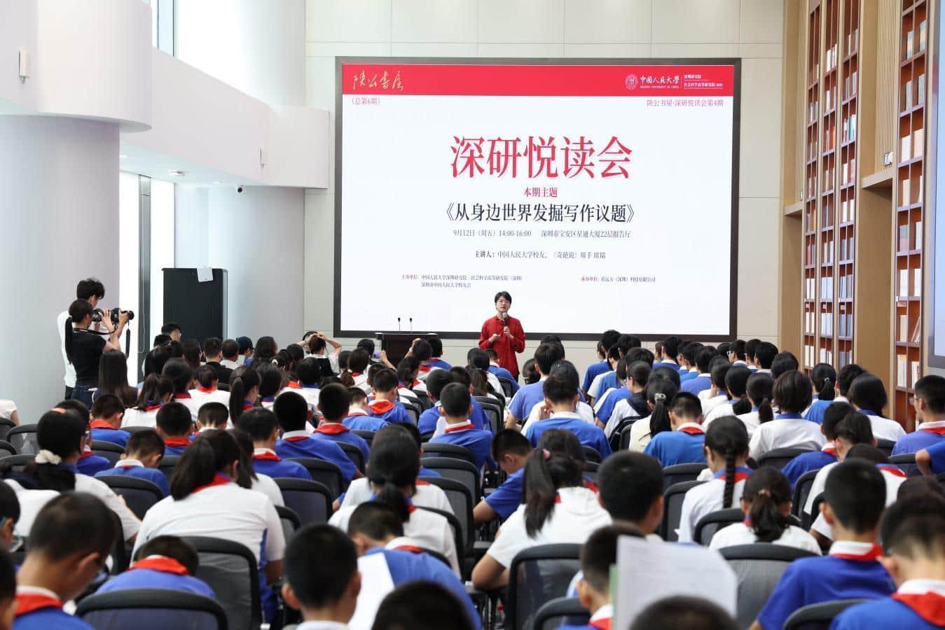 9月12日,“陕公书屋・深研悦读会”第四期在中国人民大学深圳研究院前海院区成功举办。本次活动由中国人民大学深圳研究院、深圳市中国人民大学校友会主办,看远方(深圳)科技有限公司承办,特邀中国人民大学校友、《奇葩说》辩手、杨澜读书轮值主编席瑞,以“从身边世界发掘写作议题”为主题,为来自宝安中学、新安中学等宝安中小学近200名学生带来了一堂别开生面的写作课,活动由中国人民大学校友、看远方(深圳)科技有限公司创始人任汝茂主持。这不仅是一场文学与思辨的盛宴,更是中国人民大学深圳研究院推动大中小学教育一体化、服务宝安基础教育创新的生动缩影。