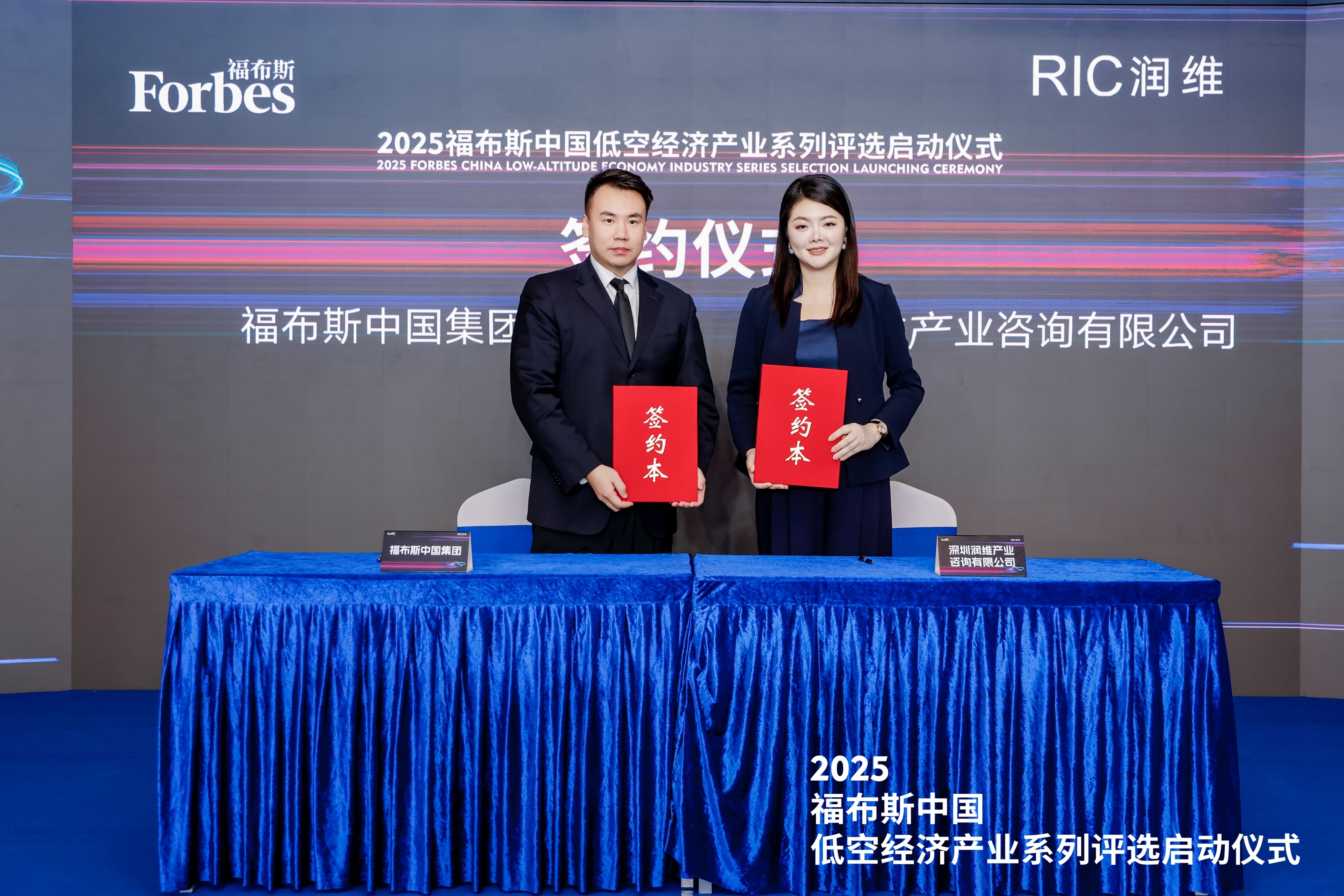 福布斯中国集团代表郭隽祎和润维产业咨询有限公司创始人兼CEO孟苏卿进行合作签约,双方联合发布2025福布斯中国低空经济产业系列评选活动,共同高效推进评选顺利进行,推动福布斯第一个低空经济领域榜单落地,助力低空产业高质量发展。
