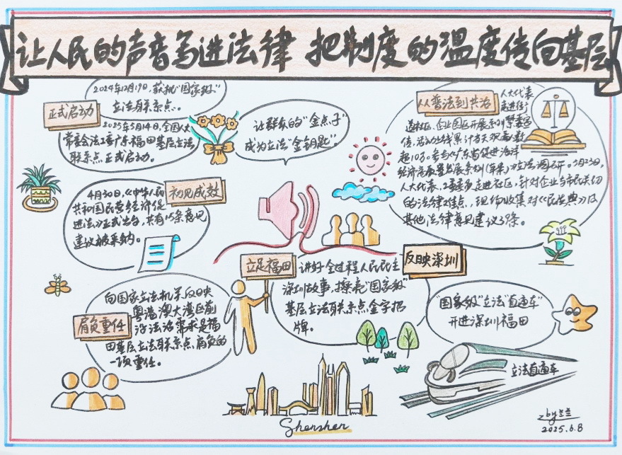 2024年12月,福田区人大常委会被确定为全国人大常委会法工委基层立法联系点,成为全国经济特区城市中首个“国家级”基层立法联系点,填补了经济特区在国家立法直通车体系中的空白。自此,福田区开启了以“国家级”基层立法联系点重要平台为依托,积极探索健全吸纳民意、汇集民智工作机制的创新实践,在经济、民生立法征询等方面先行先试,推动更多基层民意、深圳实践、特区声音直通国家立法机关,有效拓展了群众参与立法的深度与广度,更成为国家立法听取“一线声音”的重要窗口,全力为深圳乃至大湾区的高质量发展提供坚实法治保障,彰显了全过程人民民主在基层的生动实践。