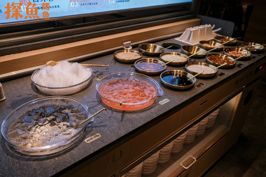 此外,探鱼最具有特色的就是冰粉自助,自助台提供10余款精致小料,桂花蜜、桃胶、燕麦爆珠、山楂片、葡萄干等,消费者可随心搭配,创作专属自己的一碗臻品冰粉,让更多消费者喜爱探鱼。