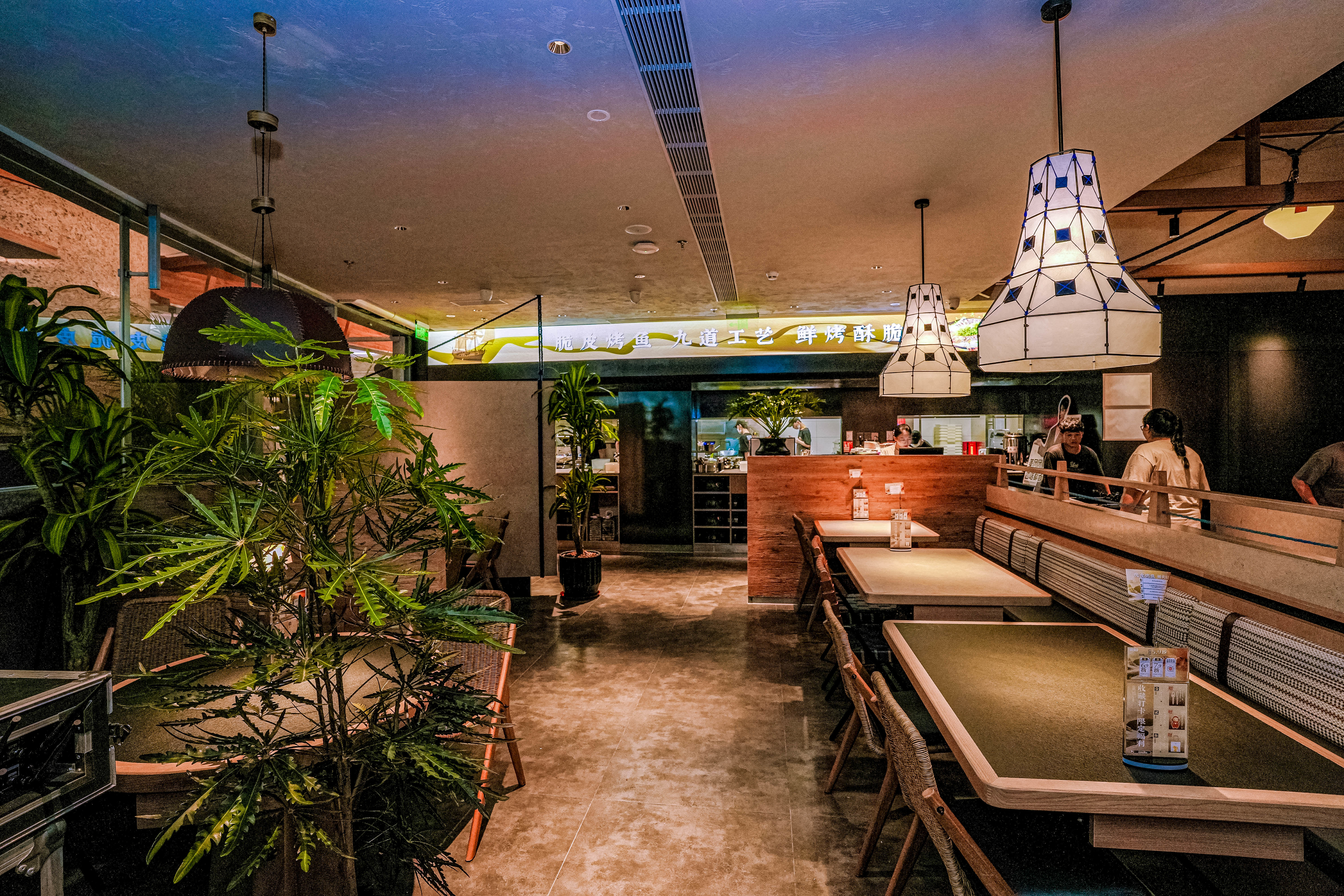 门头与天花保留渔船船体的横向拼接创意,以环形动线布局打破传统围合,步入中庭后豁然开朗——悬吊的整艘做旧金属渔船仿佛深海沉船骤然跃入视野,底部嵌入线性光装置模拟光线穿透船体的朦胧效应,对话原始性与创新性,这一升级反映出探鱼对当代都市消费者——尤其是年轻群体——审美变迁的敏锐回应,致力于让顾客在简约而不失质感的环境中,更沉浸地享受美食与交流。