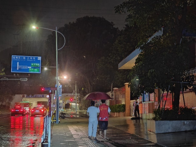 傍晚时分,深国交项目工地的一位工友在侨香学校应急避难点门口焦急万分——他的同伴因故失联,手机关机,风雨中情况不明。社区应急小分队接到求助后,立即启动应急预案。队员罗邦、黄鹤等人携带装备冒雨出发,依据有限线索在夜色中展开拉网式搜寻。经过一个多小时的不懈努力,终于在香蜜原著小区附近找到了这位迷路的工友。雨幕下,罗邦迅速撑起红色雨伞为其遮挡,黄鹤在一旁小心护送,三人穿过积水街道的身影,在路灯映照下格外温暖。他们一路安抚工友情绪,最终安全将其护送回避难点。这次雨夜救援,不仅是社区应急体系高效运转的生动体现,更让异乡务工者感受到了“家”的温暖与这座城市的真情。
